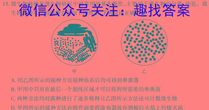 15.微生物接种是微生物研究中最常用的基本操作,主要用于微生物的分离、纯化。微生物接种常用的两种方法如下图所示,下列叙述正确的是A.用乙图所示的接种方法接种培养后均可得到单菌落B.甲图中只有在最后一个划线区域才可以得到所需要的单菌落C.两种方法均对菌种进行了逐步稀释且乙图所示方法还可计数微生物D.甲图所示的接种方法在操作前要将涂布器放在酒精灯火焰上灼烧灭菌