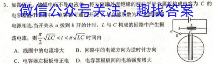 3.如图所示,储罐中有不导电液体,将与储罐外壳绝缘的两块平行金属板构成电容为C的电容器置于储罐中,电容器可通过开关S与自感系数为L的线圈或电源相连.当开关从a拨到b开始计时,L与C构成的回路中产生振荡电流,则2LC<t<LC时间内A.线圈中的电流增大B.回路中的电流方向为逆时针方向C.电容器左极板带正电D.电容器极板间的电场强度增大