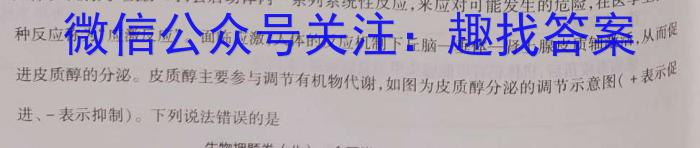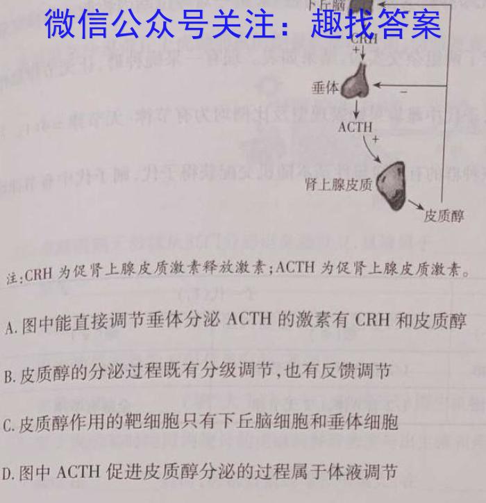 3.人体在识别到“威胁”时,会启动体内一系列系统性反应,来应对可能发生的危险,在医学上把这种反应称为“应激反应”。面临应激,人体的反应机制下丘脑一垂体一肾上腺皮质轴激活,从而促进皮进皮质醇的分泌。皮质醇主要参与调节有机物代谢,如图为皮质醇分泌的调节示意图(+表示促进、一表示抑制)。下列说法错误的是注:CRH为促肾上腺皮质激素释放激素;ACTH为促肾上腺皮质激素。ACTHCRHA.图中能直接调节垂体分泌ACTH的激素有CRH和皮质醇ACTHB.皮质醇的分泌过程既有分级调节,也有反馈调节C.皮质醇作用的靶细胞只有下丘脑细胞和垂体细胞D.图中ACTH[促进皮质醇分泌的过程属于体液调节