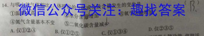 14.与吸入的气体相比,人体呼出的气体成分及含量发生的变化是B、①温度升高②水分含量增加③氧气含量增加④氮气含量基本不变⑤二氧化碳含量减少D.仅②③⑤A.仅①②④B.仅①②⑤C.仅①③④