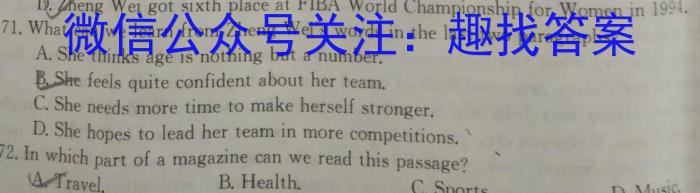 Zheng We i got sixth place at FIBA World Championship for Women in 1994.71. What can we learn from Zheng We i’s words in the last two paragraphs?A. She think s age is nothing butnumber.B. SShe feels quite confident about her team.C. She needs more time to make herself stronger.D. She hopes to lead her team in more competitions.72. In which part of a magazine can we read this passage?A.Travel.B. Health.