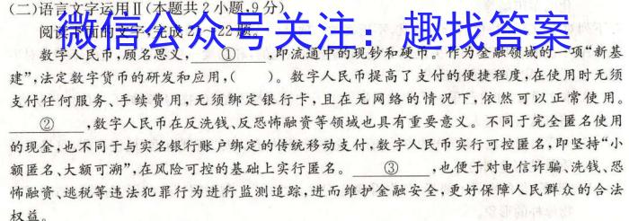19.文中画横线的句子有语病,请进行修改,使语言表达准确流畅。可少量增删词语,不得改变原意。(4分)(二)语言文字运用Ⅱ(本题共2小题,9分阅读下面的文字,完成21∼22题。数字人民币,顾名思义,①,即流通中的现钞和硬币。作为金融领域的一项“新基建”,法定数字货币的研发和应用,()。数字人民币提高了支付的便捷程度,在使用时无须支付任何服务、手续费用,无须绑定银行卡,且在无网络的情况下,依然可以正常使用。②,数字人民币在反洗钱、反恐怖融资等领域也具有重要意义。不同于完全匿名使用的现金,也不同于与实名银行账户绑定的传统移动支付,数字人民币实行可控匿名,即坚持“小额匿名、大额可溯”,在风险可控的基础上实行匿名。③,也便于对电信诈骗、洗钱、恐怖融资、逃税等违法犯罪行为进行监测追踪,进而维护金融安全,更好保障人民群众的合法权益。