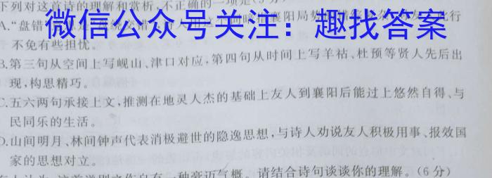 15.下列对这首诗的理解和赏析,不正确的一项是(3分)A.“盘错”意思是“盘绕交错”,诗人用这个词暗指襄阳局势的错综复杂,对友人此行不免有些担忧。B.第三句从空间上写幌山、津口对应,第四句从时间上写羊祜、杜预等贤人先后出现,构思精巧。C.五六两句承接上文,推测在地灵人杰的基础上友人到襄阳后能过上悠然自得、与民同乐的生活。D.山间明月、林间钟声代表消极避世的隐逸思想,与诗人劝说友人积极用事、报效国家的思想对立。