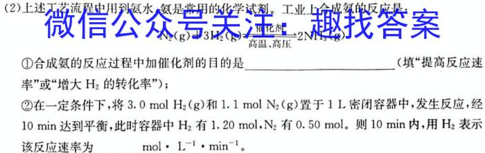 (2)上述工艺流程中用到氨水,氨是常用的化学试剂。工业上合成氨的反应是:N2(g)+3H2(g)2NH3(g)①合成氨的反应过程中加催化剂的目的是(填“提高反应速率”或“增大H2的转化率”);②在一定条件下,将3.0molH2(g)和1.1molN2(g)置于1L密闭容器中,发生反应,经10min达到平衡,此时容器中H2有1.20mol,N2有0.50mol。,则10min内,用H2表示该反应速率为molL^-1^-1。