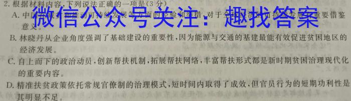 2.根据材料内容,下列说法正确的一项是(3分)A.中国在减贫和推动可持续发展等方面的经验和举措,对于全球经济的可持续发展有重要借鉴意义。B.林晓丹从企业角度强调了基础建设的重要性,因为能源与交通的基建最能有效促进贫困地区的经济发展。C.自上而下的政治动员,创新帮扶机制,拓展帮扶网络,丰富帮扶形式都是新时期贫困治理现代化的重要内容。D.精准扶贫政策依托常规官僚制的治理模式,短时间内取得了成效,但官员行为的短期功利性是其明显不足。