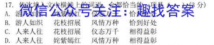 17.依次填入文中横线上的词语,全都恰当的一项是()(3分)A.游人如织姹紫嫣红仪态万千恰到好处B.游人如织花枝招展风情万种恰到好处C.人来人往花枝招展仪态万千相得益彰D.人来人往姹紫嫣红风情万种相得益彰