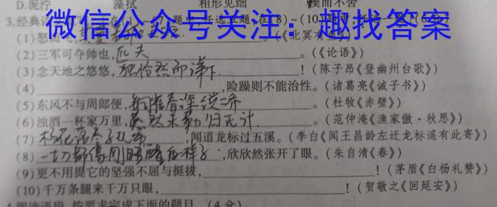 3.经典诗文默写在(1)~(7)题中,任选五题;在(8)~(10)题中,任选题](6分)(1)怒而飞,其要若振天讼.。(《北冥有鱼》)(2)三军可夺帅也,匹天。(《论语》)(3)念天地之悠悠,独怡然而涕下!(陈子昂《登幽州台歌》(4)险躁则不能治性。(诸葛亮《诚子书》)(5)东风不与周郎便,更,有。(杜牧《赤壁》)(6)浊酒一杯家万里,。(范仲淹《渔家傲·秋思》)(7)杨花落尽子闻道龙标过五溪。(李白《闻王昌龄左迁龙标遥有此寄》)(8)一切都像刚归醒的一样子二,欣欣然张开了眼。(朱自清《春》)(9)更不用提它的坚强不屈与挺拔,!(茅盾《白杨礼赞》)(10)千万条腿来千万只眼,!(贺敬之《回延安》)