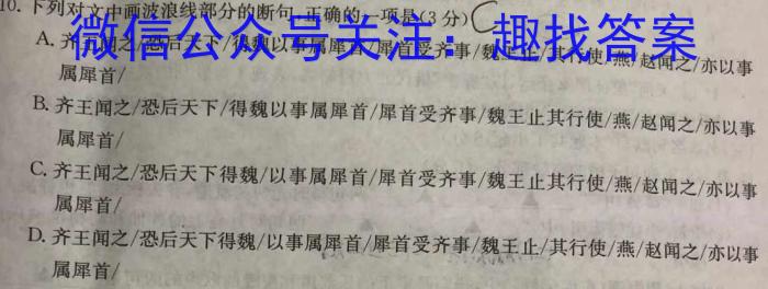 10.下列对文中画波浪线部分的断句,正确的一项是(3分)CA.齐王闻之/恐后天下/得魏以事属犀首/犀首受齐事/魏王止/其行使/燕/赵闻之/亦以事属犀首/B.齐王闻之/恐后天下/得魏以事属犀首/犀首受齐事/魏王止其行使/燕/赵闻之/亦以事属犀首/C.齐王闻之/恐后天下得魏/以事属犀首/犀首受齐事/魏王止其行使/燕/赵闻之/亦以事属犀首/D.齐王闻之/恐后天下得魏/以事属犀首/犀首受齐事/魏王止/其行使/燕/赵闻之/亦以事属犀首/