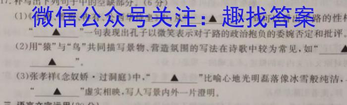 17.补写出下列句子中的空缺部分。(6分)(1)《子路、曾皙、冉有、公西华侍坐》中,从“▲▲”一句可以看出子路的性““▲▲”一句表现出孔子以微笑表示对子路的政治抱负的委婉否定和批评。(2)用“猿”与“鸟”共同描写景物、营造氛围的写法在诗歌中较为常见,如“▲”。(3)张孝祥《念奴娇·过洞庭》中,“▲▲”比喻心地光明磊落像冰雪般纯洁,“▲”虚实相映,写人写景内外一片澄明,