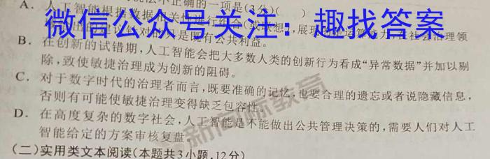 3.根据原文内容,下列说法不正确的一项是(3分)()A.人工智能根据数据相关性进行组合(或联想),展现的是运算能力,在社会治理领域给出的建议针对的只是既有公共利益。在创新的试错期,人工智能会把大多数人类的创新行为看成“异常数据”并加以剔除,致使敏捷治理成为创新的阻碍。C.对于数字时代的治理者而言,既要准确的记忆,也要合理的遗忘或者说隐藏信息,否则有可能使敏捷治理变得缺乏包容D.在高度复杂的数字社会,人工智能是不能做出公共管理决策的,需要人们对人工智能给定的方案审核复盘