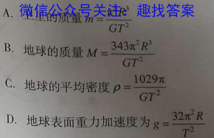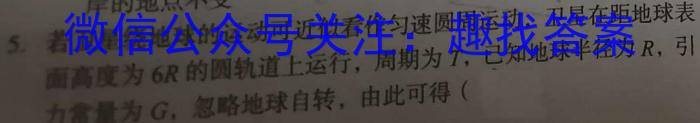 5.若卫星绕地球的运动可近似看作匀速圆周运动,卫星在距地球表面高为6R的圆轨道上运行,周期为T,已知地球半径为R,引力常量为G.忽略地球自转,由此可得((A.卫星的质量m=^2R^3GT^2B.地球的质量M=343^2R^3GT^2C.地球的平均密度=1029GT^2D.地球表面重力加速度为g=32^2RT^2