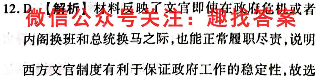 12.D 【解析】材料反映了文官即使在政府危机或者内阁换班和总统换马之际,也能正常履职尽责,说明西方文官制度有利于保证政府工作的稳定性,故选 D项;材料并未反映文官与“专制”的关系,且“杜绝”二字过于绝对,排除A项;材料的重点是文官存在本身可以维持政府政策的连续性和稳定性,与文官的素质无关,排除B项;材料反映的是在资本主义国家出现问题时,文官能起到稳定社会的作用,与官员腐败现象无关,且“消除”二字过于绝对,排除C项。