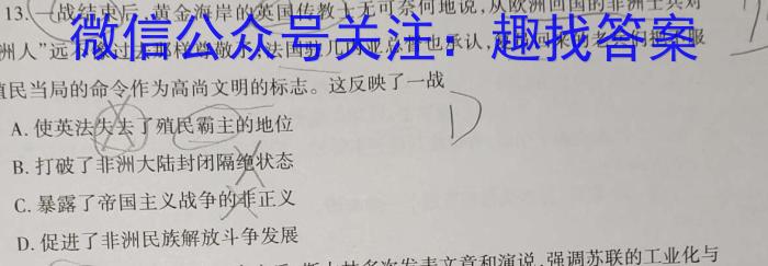 13.战结束后,黄金海岸的英国传教士无可奈何地说,从欧洲回国的非洲士兵对“欧洲人”远不像过去那样尊敬了;法国驻几内亚总督也承认,复员回来的老兵们把不服从殖民当局的命令作为高尚文明的标志。这反映了一战A.使英法失去了殖民霸主的地位B.打破了非洲大陆封闭隔绝状态C.暴露了帝国主义战争的非正义D.促进了非洲民族解放斗争发展1