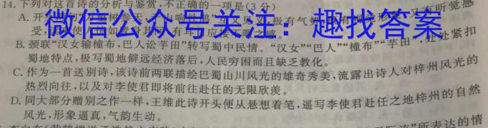 14.下列对这首诗的分析与鉴赏,不正确的一项是(3分)A.开头两句“万壑树参天,千山响杜鹃”互文见义,极有气势,既有视觉形象,又有听觉感受,读来使人恍如置身其间,有耳目应接不暇之感。紧B.颈联“汉女输橦布,巴人讼芋田”转写蜀中民情。“汉女”“巴人”“橦布”“芋田”,处处紧扣蜀地特点,极写蜀地僻远经济落后,人民穷困而且缺乏教化。C.作为一首送别诗,该诗前两联描绘巴蜀山川风光的雄奇秀美,流露出诗人对梓州风光的热烈向往,以及对李使君即将前往赴任的无限欣羡。然D.同大部分赠别之作一样,王维此诗开头便从悬想着笔,遥写李使君赴任之地梓州的自然风光,形象逼真,气韵生动。情
