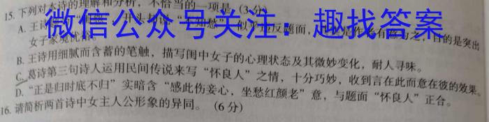 15.下列对本诗的理解和分析,不恰当的一项是(3分),开头却说A.王诗题为“闺怨”,开头却说“不知愁”,似乎违反题面,其实是作者有意为之,目的是突出女子家境优裕。B.王诗用细腻而含蓄的笔触,描写闺中女子的心理状态及其微妙变化,耐人寻味。C.葛诗第三句诗人运用民间传说来写“怀良人”之情,十分巧妙,收到言在此而意在彼的效果。D.“正是归时底不归”实暗含“感此伤妾心,坐愁红颜老”意,与题面“怀良人”正合。的效果。16.请简析两首诗中女主人公形象的异同。(6分)