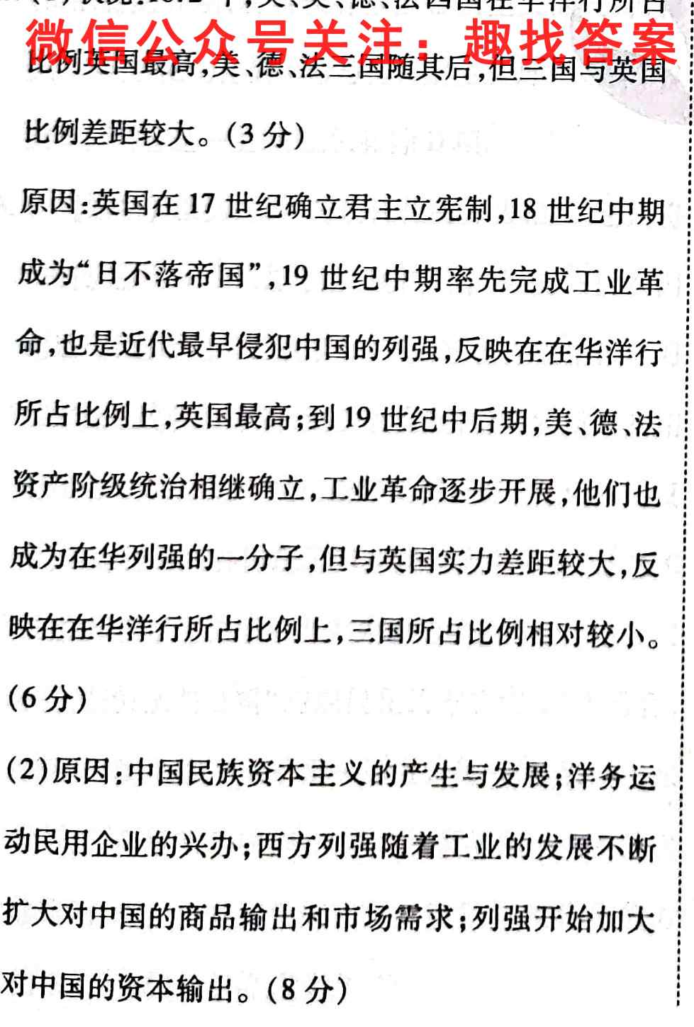 16.(1)状况:1872年,英、美、德、法四国在华洋行所占比例英国最高,美、德、法三国随其后,但三国与英国比例差距较大。(3分) 原因:英国在17世纪确立君主立宪制,18世纪中期成为“日不落帝国”,19世纪中期率先完成工业革命,也是近代最早侵犯中国的列强,反映在在华洋行所占比例上,英国最高;到19世纪中后期,美、德、法资产阶级统治相继确立,工业革命逐步开展,他们也成为在华列强的一分子,但与英国实力差距较大,反映在在华洋行所占比例上,三国所占比例相对较小。(6分) (2)原因:中国民族资本主义的产生与发展;洋务运动民用企业的兴办;西方列强随着工业的发展不断扩大对中国的商品输出和市场需求;列强开始加大对中国的资本输出。(8分) 影响:使中国自然经济进一步解体,日益被卷人资本主义世界市场体系;中国在中外贸易中由出超向人超转变,并成为常态;导致了西方列强在华经济势力的扩张;外资在华势力快速膨胀。(8分) 【解析】(1)第一小问状况,据材料一的柱状图,英国高达60%,美国占10%,德国接近10%,法国最低,可总结出,英国最高,美、德、法三国随其后,但三国与英国比例差距较大。第二小问原因,联系所学.知识,英国在17世纪确立君主立宪制,18世纪中期成为“日不落帝国”,19世纪中期率先完成工业革命,也是近代最早侵犯中国的列强;19世纪资本主义制度向欧洲大陆扩展,所以19世纪中后期美、德、法的政治经济状况是,资产阶级统治相继确立,工业革命逐步开展,他们也成为在华列强的一分子,但与英国实力差距较大。 (2)第一小问原因,据材料二的数据,1870—1884年中国出口比重显著增加,且处于出超地位,结合所学,六七十年代洋务运动兴办,中国民族资本主义产生及发展,都有利于中国的出口;1885年之后,虽然中国出口值依然在上升,但由出超转为入超局面,这是因为列强不断向中国商品输出,以及逐渐加大对中国的资本输出。第二小问影响,中国进口总值持续增高,体现出中国对世界市场的依赖日益加深,使中国自然经济进一步解体,日益被卷入资本主义世界市场体系;由材料二数据可知,中国在中外贸易中由出超向人超转变,并成为常态;1885年之后的持续人超局面,列强的商品输出和逐渐加大的资本输出,导致了西方列强在华经济势力的扩张;列强对华经济侵略加剧外资在华势力快速膨胀。