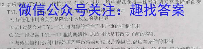 13.泰乐菌素(TYL)是一种抗生素,研究人员从土壤中筛选获得一株泰乐菌素高效降解菌株TYL-T1。、下列有关TYL一T1胞内酶的叙述正确的是A.酶催化作用的实质是降低化学反应的活化能B.pH过低会对TYL-T1胞内酶的活性产生严重的抑制作用C.Co^2+能提高TYL-T1胞内酶活性,原因可能是其改变了酶的构象D.与微生物相比,利用酶处理环境污染物可克服营养物质、温度等条件的限制