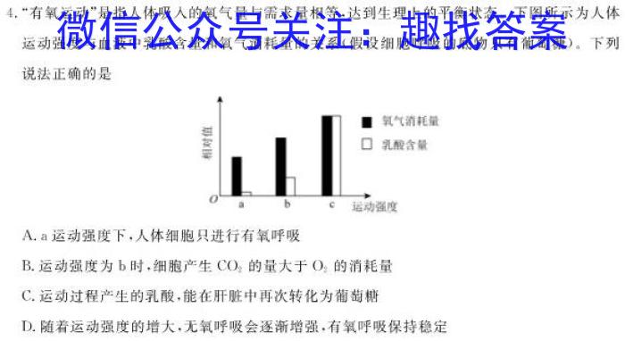 4.“有氧运动”是指人体吸入的氧气量与需求量相等,达到生理上的平衡状态。下图所示为人体运动强度与血液中乳酸含量和氧气消耗量的关系(假设细胞呼吸的底物只有葡萄糖)。下列说法正确的是A.a运动强度下,人体细胞只进行有氧呼吸B.运动强度为b时,细胞产生CO2的量大于O2的消耗量C.运动过程产生的乳酸,能在肝脏中再次转化为葡萄糖D.随着运动强度的增大,无氧呼吸会逐渐增强,有氧呼吸保持稳定