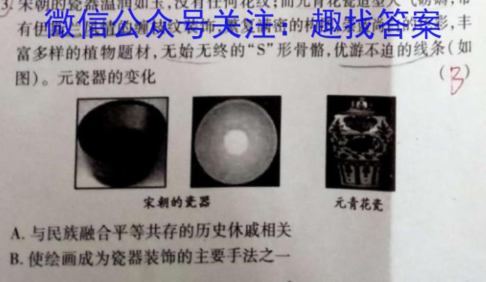 (3.宋朝的瓷器温润如玉,没有任何花纹;而元青花瓷造型大气磅礴,带有伊斯兰风情的缠枝纹装饰,繁复满密的构图,崇蓝尚白的色彩,丰富多样的植物题材,无始无终的“S”形骨骼,优游不迫的线条(如图)。元瓷器的变化A.与民族融合平等共存的历史休戚相关B.使绘画成为瓷器装饰的主要手法之一Cl是深受外国文化影响的特殊艺术产物D.成为了中国传统粉彩彩瓷器的发展源头