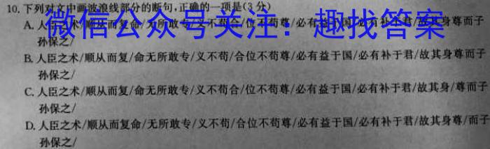 10.下列对文中画波浪线部分的断句,正确的一项是(3分)A.人臣之术/顺从而复命/无所敢专/义不苟合/位不苟尊/必有益于国/必有补于君/故其身尊而子孙保之/B.人臣之术/顺从而复/命无所敢专/义不苟/合位不苟尊/必有益于国/必有补于君/故其身尊而子孙保之/C.人臣之术/顺从而复/命无所敢专/义不苟合/位不苟尊/必有益于国/必有补于君/故其身/尊而子孙保之/D.人臣之术/顺从而复命/无所敢专/义不苟/合位不苟尊/必有益于国/必有补于君/故其身尊/而子孙保之/