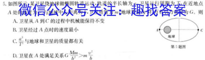 5.如图所示,某卫星绕地球做椭圆轨道运动,轨道的半长轴为a,,卫星运行周期为,在近地点A处的速度为v、与地球中心距离为b,卫星质量为m,地球质量为M,万有引力常量为Gn则A.卫星从A到C的过程中机械能保持不变B.卫星经过A点时的速度最小C.a^3T与地球和卫星的质量都有关D.卫星在A处满足关系GMmb^2>mv^2b