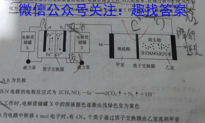 +2+3-411.用铁铬液流电池作为电解装置的电源,电解处理含NO2的废水,处理过程中中化为无毒无害的气体,M、N均为石墨电极。有关该装置工作时的说法,错误的是b1CF电解质电解质微生物降行储罐罐储罐MXY稀硫酸含CH3NO2的污水还受Fe^2+甲室质子交换膜磁力泵力泵乙室质子交换膜A.b为负极B.N电极的电极反应式为2CH3NO2-6e^-2CO2+N2+6H^+C.工作时,电解质储罐X中的溶液颜色逐渐由浅绿色变为黄色D.当电路中转移4mol电子时,有4NA个质子通过质子交换膜由乙室流到甲室