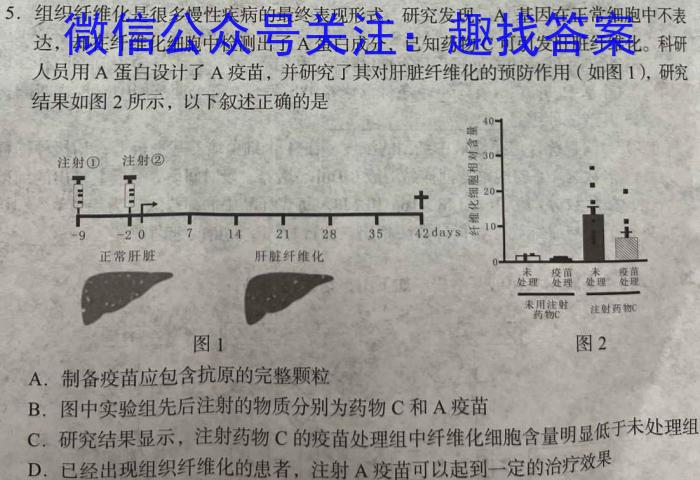 5.组织纤维化是很多慢性疾病的最终表现形式,研究发现,A基因在正常细胞中不表达,却在纤维化细胞中检测出了A蛋白成分,已知药物C可引发肝脏纤维化。科研人员用A蛋白设计了A疫苗,并研究了其对肝脏纤维化的预防作用(如图1),研究结果如图2所示,以下叙述正确的是A.制备疫苗应包含抗原的完整颗粒B.图中实验组先后注射的物质分别为药物C和A疫苗C.研究结果显示,注射药物C的疫苗处理组中纤维化细胞含量明显低于未处理组D.已经出现组织纤维化的患者,注射A疫苗可以起到一定的治疗效果