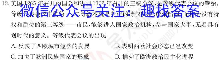 12.英国1265年召开的国会和法国1302年召开的三级会议,是等级代表会议的肇始。等级代表会议中的第一、二等级本就是封建的特权阶层、统治阶级,而作为没有特权和爵位的第三等级——市民,能够进入国家政治机构,参与国家大事,无疑具有划时代的意义。等级代表会议的出现A.反映了西欧城市经济的发展B.表明西欧社会形态已经改变C.加快了欧洲民族国家的形成D.推动了欧洲政治民主化进程