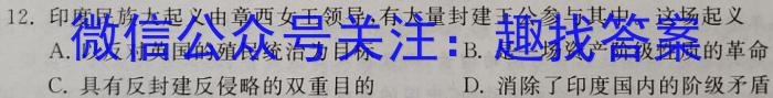 12.印度民族大起义由章西女王领导,有大量封建王公参与其中。这场起义A.以反对英国的殖民统治为目标B.是一场资产阶级性质的革命C.具有反封建反侵略的双重目的D.消除了印度国内的阶级矛盾