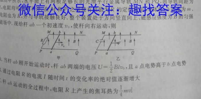1.如图甲所示,水平面上有两根足够长的光滑平行金属导轨MN和PQ,两导轨间距为l,电阻均可忽略不计.在M和P之间接有阻值为R的定值电阻,导体杆ab质量为m、电阻也为R,并与导轨接触良好.整个装置处于方向竖直向上、磁感应强度为B的匀匀强磁场中.现给杆ab一个初速度v0,,使杆向右运动,则甲A.当压B.通当杆ab刚开始运动时,杆ab两端的电压U=12Blv0,且aB.通过电阻R的电流I随时间t的变化率的绝对值逐渐增大C.杆ab运动的全过程中,电阻R上产生的焦耳热为14mv0^2点电势高于b点电势