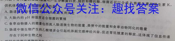 12.大肠中有大量的细菌,细菌可产生分解蛋白质、脂肪和糖的酶,细菌还可以合成B族维生素和维生素K,供机体利用。下列说法错误的是()A.肠道微生物和动物的种间关系是互利共生B.大肠内的pH和温度适合细菌的繁殖C.食草动物摄入的能量包括流入肠道微生物的能量、粪便中的能量和食草动物同化的能量D.肠道中微生物产生的乙酸增多会引起机体副交感神经兴奋,促进胃饥饿素的释放,这体现了信息传递存在于同种生物之间