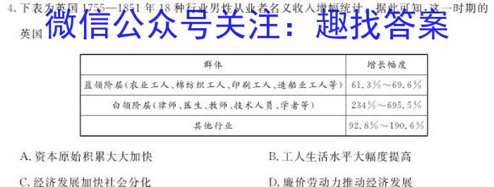 4.下表为英国1755—1851年18种行业男性从业者名义收入增幅统计。据此可知,这一时期的英国A.资本原始积累大大加快B.工人生活水平大幅度提高C.经济发展加快社会分化D.廉价劳动力推动经济发展