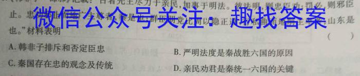 1.《韩非子·饰邪》记载:“古者先王尽力于亲民,加事于明法。彼法明,则忠臣劝;罚必,则邪臣止。忠劝邪止而地广主尊者,秦是也;群臣朋党比周以隐正道、行私曲而地削主卑者,山东是也。”材料表明()A.韩非子排斥和否定臣忠B.严明法度是秦战胜六国的原因C.秦国存在忠的观念及传统D.亲民劝君是秦统一六国的关键