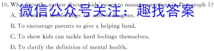 10.Why does the author discuss kids’ways to manage emotions in Paragraph 5?A.To confirm bad feelings are sure to be gone.B.To encourage parents to give a helping hand.C.To show kids can tackle hard feelings themselves.D.To clarify the definition of mental health.