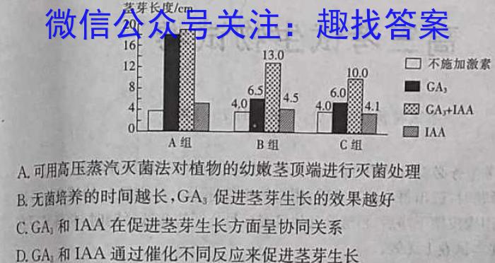 茎芽长度/cm20163.012口不施加激素10.086.6.54.56.0GA34.04.04.14GA3+IAAIAAA组B组C组A.可用高压蒸汽灭菌法对植物的幼嫩茎顶端进行灭菌处理B.无菌培养的时间越长,GA3促进茎芽生长的效果越好C.GA3,和IAA在促进茎芽生长方面呈协同关系D.GA1和IAA通过催化不同反应来促进茎芽生长