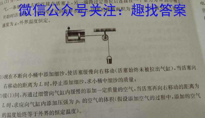 12(11分)如图所示,水平固定不动、导热性能良好的气缸内用光滑活塞封闭着一定质量的空13.定质质量的空气,一条细线的左端连接在活塞上,另一端跨过定滑轮后连接在一个重力为m的小桶上上开始时活塞静止,气缸内空气的水平长度L,活塞的横截面积为S。大气压强为po,重力mp0,力速度为g,外界温度恒定。(1)现在不断向小桶中添加细沙,使活塞缓慢向右移动(活塞始终未被拉出气缸),当活塞向右移动的距离为L时,停止添加细沙,求小桶中细沙的质量;(2)接(1)问,再通过细管向气缸内缓慢的添加一定质量的空气,当活塞再向右移动的距离为L时,求应向气缸内添加压强为p0的空气的体积(假设添加空气的过程中,添加的空气