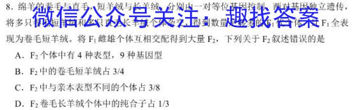 8.绵羊的卷毛与直毛,短羊绒与长羊绒,分别由一对等位基因控制,两对基因独立遗传,将多只卷毛短羊绒和多只直毛长羊绒个体杂交,得到数量足够多的F1代个体,且F1全表现为卷毛短羊绒。将F1雌雄个体互相交配得到大量F2,,下列关于F2叙述错误的是A.F2个体中有4种表型,9种基因型B.F2中的卷毛短羊绒占3/4C.F2中与亲本表型不同的个体占3/8D.F2卷毛长羊绒个体中的纯合子占1/3