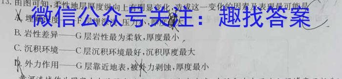 13.由图可知,柔性地层厚度纵向上有明显变化,造成这一变化的因素及表现最可能是0埋藏深度—F层埋深浅,压力小,厚度B.岩性差异f=层岩性最为柔软,厚度最小,C.沉积环境层沉积环境最好,沉积厚度最大外力作用G层靠近地表成力力剥蚀,厚度最小