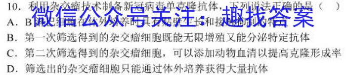 10.利用杂交瘤技术制备新冠病毒单克隆抗体,下列说法正确的是()A.B淋巴细胞在体外培养时具有贴壁生长和接触抑制的特点B.第一次筛选得到的杂交瘤细胞既能无限增殖又能分泌特定抗体C.第二次筛选得到的杂交瘤细胞,可以添加动物血清以提高克隆形成率D.筛选出的杂交瘤细胞只能通过体外培养获得大量抗体