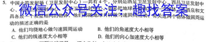 5.中国火箭发射场(卫星发射中心)一共有4个,分别是酒泉卫星发射中心、西昌卫屋发射中心、太原卫星发射中心、文昌卫星发射中心。如果把地球近似地看成一个球体,在酒泉和文昌各放一个质量相同的物体,他们都随地球自转做匀速圆周运动,有关这两个物体做圆周运动的描述正确的是A.他们均绕地心做匀速圆周运动B.他们的角速度大小相等C.他们的线速度大小相等D.他们的向心加速度大小相等