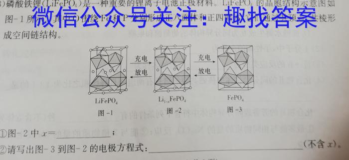 (3)磷酸铁钾(LiFePO4)是一种重要的锂离子电池正极材料。LiFePO4的晶胞结构示意图如图-1所示。其中O围绕Fe和P分别形成正八面体和正四面体,它们通过共顶点、共棱形成空间链结构。图-1①图-2中x=闲音(不含x)②请写出图-3到图-2的电极方程式: