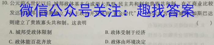 10.公元前6世纪以后,城邦政体基本分成两大类型:民主共和制和贵族共和制。在工商业比较发达的城邦,如雅典确立了民主政治并发展到“黄金时代”。一些以农为本的城邦,如斯巴达则建立了贵族寡头共和制。这表明()A.城邦受政体限制B.政体受制于经济C.政体能百花齐放D.政体由环境决定