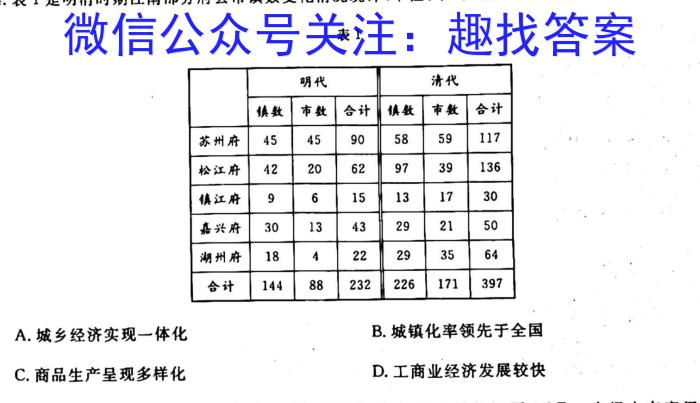 4.表1是明清时期江南部分府县市镇数变化情况统计(单位:个)。据此可知,当时的江南地区表1A.城乡经济实现一体化B.城镇化率领先于全国C.商品生产呈现多样化D.工商业经济发展较快