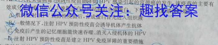 10.HPV(人乳头瘤病毒)预防性疫苗能降低HPV感染引起的宫颈癌的发生,该疫苗的主要有效成分是具有HPV-L1晚期蛋白空间结构的合成蛋白。下列有关叙述错误的是A肌肉注射HPV预防性疫苗后,合成蛋白首先进人组织液B般情况下,注射HPV预防性疫苗会诱导机体产生抗体C,免疫后产生的记忆细胞能快速吞噬、消灭人侵机体的HPVD.注射HPV预防性疫苗是建立HPV免疫屏障的重要措施