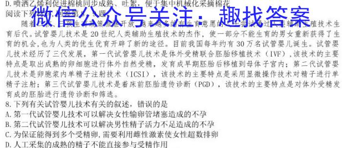 随着二孩、三孩生育政策相继开放,越来越多的有生育意愿的人士尝试通过人类辅助生殖技术生育后代。试管婴儿技术是20世纪人类辅助生殖技术的杰作,使一部分不能生育的男女重新获得了生育的机会,也为人类的优生优育开辟了新的途径。目前我国每年约有30万名试管婴儿诞生。试管婴儿技术经历了三代发展,第一代试管婴儿技术是体外受精联合胚胎移植技术(IVF),该技术的主要特点是取出成熟的卵细胞进行体外自然受精,发育成早期胚胎后移植到母体子宫内;第二代试管婴儿技术是卵胞浆内单精子注射技术(ICSI),该技术的主要特点是采用显微操作技术对精子进行单精子注射;第三代试管婴儿技术是着床前胚胎遗传诊断(PGD),该技术的主要特点是对体外受精发育成的胚胎进行遗传诊断和筛选。8.下列有关试管婴儿技术有关的叙述,错误的是A.第一代试管婴儿技术可以解决女性输卵管堵塞造成的不孕B.第二代试管婴儿技术可以解决男性精子活力不足造成的不孕C.为保证能得到多个受精卵,需要利用雌性激素使女性超数排卵D.人工采集的成熟的精子不能直接参与受精作用