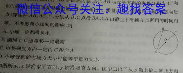 7.如图所示,竖直平面内固定一个光滑绝缘圆环,圆心为光滑绝缘轻杆AC是圆环的直径,光滑绝缘轻杆AB是圆环的弦,AC、AB与水平方向的夹角分别为45^和60^,,圆环所在空间有匀强电场(图中未画出)。质量均为m的带电小球(可视为质点)穿在杆AB、AC上,分别从B、C点沿EBA、由静止下滑到A点所用的时间相等,不考虑两小球间的影响,则A.小球一定都带负电B.周上点电势一定最高C.电场强度方向一定由C指向AD.小球受到的电场力大小可能等于重力大小