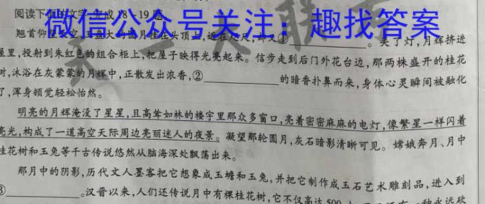 (一)语言文字运用I(本题共2小题,7分)阅读下面的文字,完成18~19题。翘首仰望天空,玉盘大的圆月挂在头顶上,近在咫尺,却又联。屋里,投射到朱红色的组合柜上,把屋子映得光亮起来。信步走到后门外花台边,那两株盛开的桂花。关了灯,月辉挤进树,沐浴在灰蒙蒙的)月辉中,正散发出浓香,②的暗香扑鼻而来,身体心灵瞬间被融化了,浑身顿觉轻松怡然。明亮的月辉淹没了星星,且高耸如林的楼宇里那众多窗口,亮着密密麻麻的电灯,像繁星一样闪羞桂花树和玉兔等千古传说悠然从脑海深处飘荡出来。亮光,构成了一道高空天际周边亮丽迷人的夜景。凝望那轮月,灰石暗影清晰可见。嫦娥奔月、月中那月中的阴影,历代文人墨客把它想象成玉蟾和玉兔,并把它制作成玉石艺术雕刻品,进入到③。汉晋以来,人们还传说月中有棵桂花树,它不仅高达500丈,而且还有一种永远砍