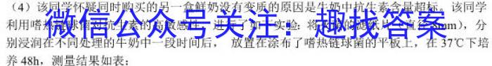 (4)该同学怀疑同时购买的另一盒鲜奶没有变质的原因是牛奶中抗生素含量超标。该同学利用嗜热链球菌对抗生素的高敏感性,进行了如下实验:将灭菌的滤纸片(直径.8mm),,分别浸润在不同处理的牛奶中一段时间后,放置在涂布了嗜热链球菌的平板上,在37^C下培养48h,测量结果如表:
