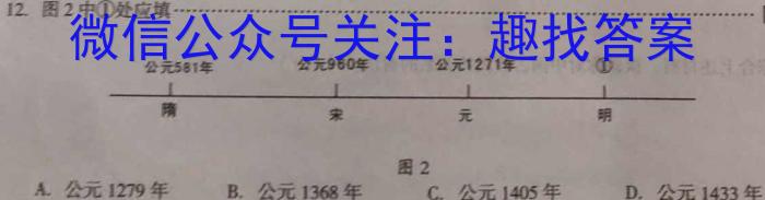 12.图2中①处应填…………………………1B公元581年公元960年公元1271年①隋宋元图2A.公元1279年B.公元1368年C.公元1405年D.公元1433年