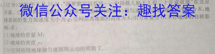 14(12分)2023年2月24日,“逐梦寰宇问苍穹——中国载人航天工程三十年成就展”在北京开幕。已知空间站绕地球(视为质量分布均匀的球体)做匀速圆周运动,地球的半径为R,,地球表面的重力加速度大小为,空间站离地面的高度为h,引力常量为G,,不计地球的自转影响,求:(1)地球的质量M;(2)地球的密度ρ;(3)空间站绕地球做匀速圆周运动的周期T。